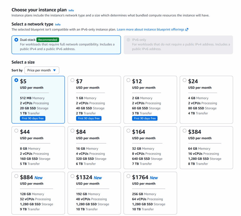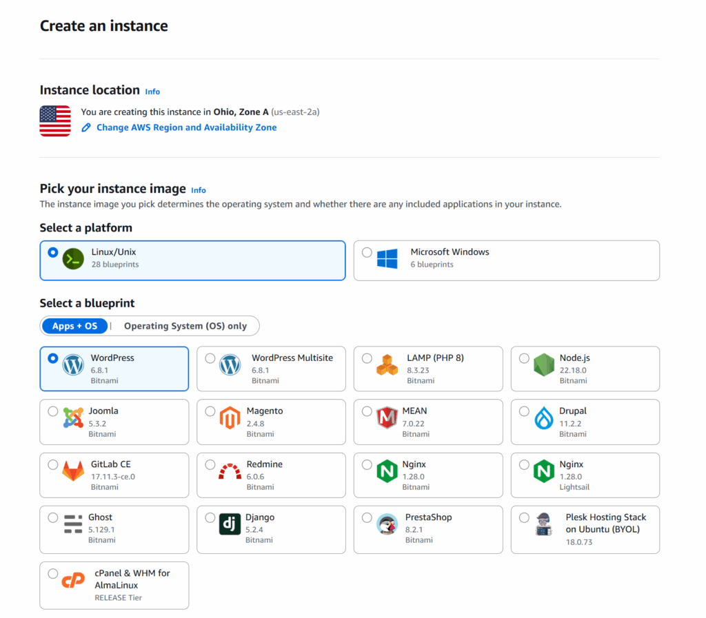 After navigating to Lightsail and selecting “Create Instance”, select the region that is closest to your target audience, for best performance. After that, pick the image that works for you.