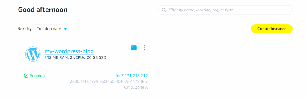 After picking a name for your instance and waiting for it to start, you can visit the public IP address, and should see a welcome page.