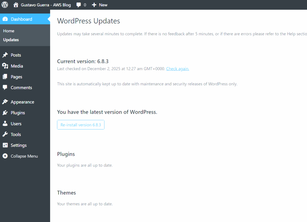 Here I installed a couple themes and plugins that I wanted to use, and updated them.